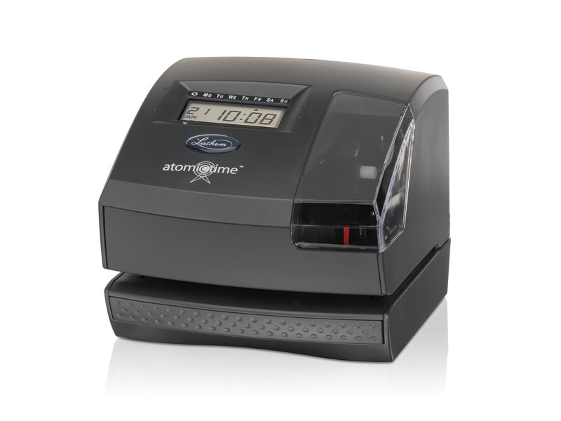 Lathem 1500E Atomic Time Recorder & Document Stamp. Using the same technology NASA employs to tell time, the Model 1500E wirelessly synchronizes with the National Institute of Standards and Technology's (NIST) atomic clock in Boulder, Colorado. In addition to confirming the time daily, the 1500E automatically adjusts for Daylight Saving Time. No wires, no worries, and no more excuses for being late. As a time clock, the 1500E records employees' in and out times for payroll accounting. As a job clock it can track project time for accurate costing. And as a document stamp, the 1500E can print the date, time and preset messages on important documents.