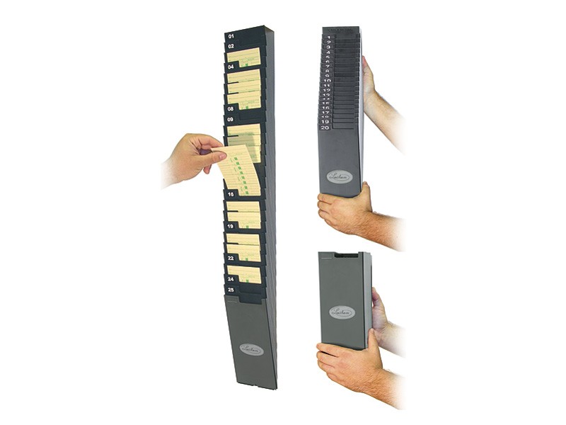 Lathem 25-7EX - Time Card Rack, 7" Cards, 25 Pockets, Expanding. Lathem's 25-pocket, expanding time card rack conveniently holds any standard time card (up to 7" long and 3.5" wide). This rack expands for easy wall mounting and can be combined with others. Excess pockets can be removed to fit your company size. The durable black plastic construction resists damage and maintains an attractive appearance in even the harshest environments. Includes pocket number labels and mounting hardware. Many companies use two racks; one on each side of the clock. As employees clock in, they move their card from the "out" rack to the "in" rack. This allows managers and supervisors a quick visual determination of who has clocked in.