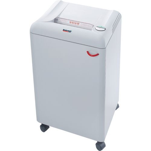The DestroyIt 2503 Strip Cut Shredder from MBM is a great heavy duty, high volume, centralized office shredder designed to shred large amounts of material daily. The DestroyIt 2503 Strip Cut Shredder features a "SPS" (Safety Protection System) package with a electronically controlled, transparent safety shield in the feed opening. It also includes an "Easy Switch" control element that uses color codes and back-lit symbols to indicate operational status. The Destroyit 2503 will automatically stop when your shred bag is full or when the cabinet door is opened. It also has an automatic reverse and stop in case of paper jam. The Destroyit 2503 Strip Cut Shredder has double protection against overheating, automatic start and stop controlled by a photo cell, high quality hardened steel cutting shafts that accept staples, paper clips, credit cards and CD's. All Destroyit shredders have a 10 year warranty on Strip Cut and Cross Cut shafts and wheels. All other parts have a 1 year warranty (excluding wearables).