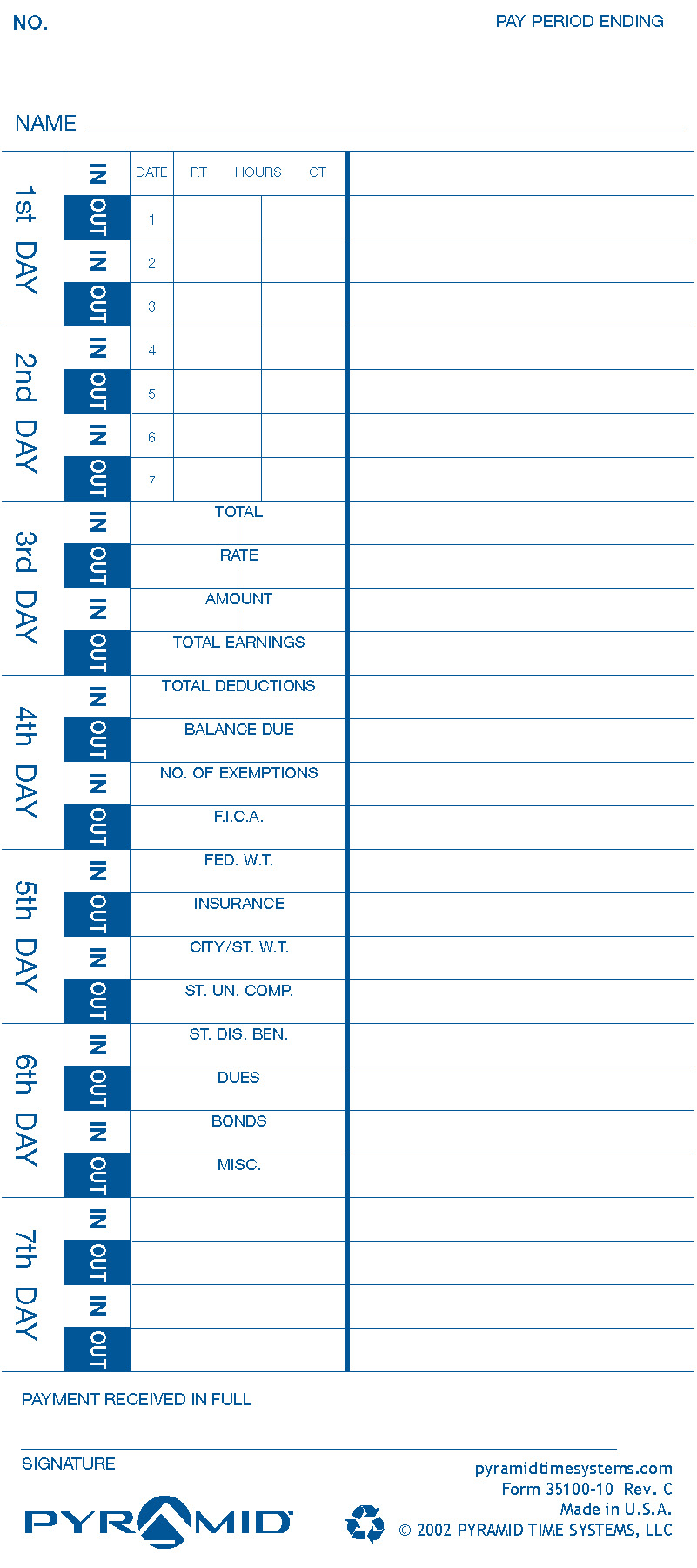 Time cards are designed to work directly with the Pyramid model 3000HD, 3500 and 3700 time clock.