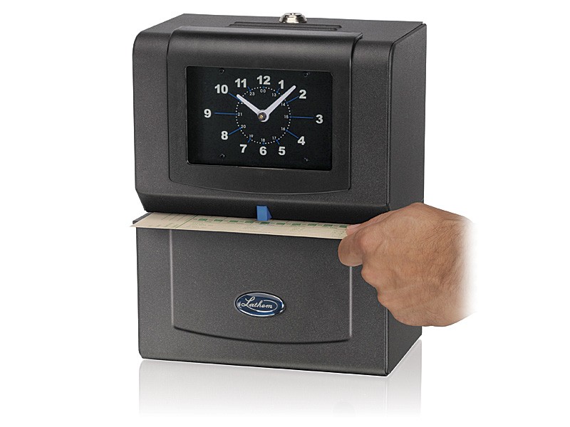 Lathem 4000 Series Heavy Duty Automatic Time Recorder. Ideal for payroll time or job costing, the 4000's rugged design can withstand high volume use and harsh environments. Featuring automatic activation, the electric coil print mechanism allows for simple one-hand operation, and instant registrations. With a large, easy to read analog clock face, steel case and key lock, the 4000 can be mounted securely to a wall or tabletop. Its two-color ribbon self-reverses at the end of the spool for longer life, and can easily be changed. Works with all standard time cards. refurbished