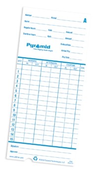 42415-10M- Time Cards for Pyramid 2600 (1000 cards). Time cards are designed to work with the model Pyramid 2600 Time Clock. Two sided cards for days1-15 and 16-31, Six columns for in/out Morning, Afternoon and Overtime.