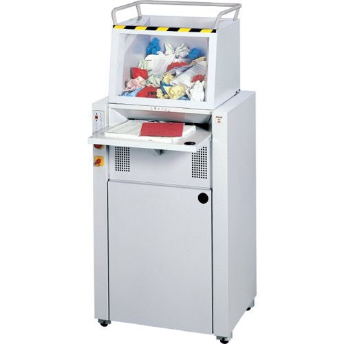 For organizations with a need for high volume shredding, an in-house shredding program based around Destroyit high capacity shredders is the most secure and economical way of disposing sensitive documents. Using a shredding service adds needless risk and expense. When you turn over documents to an outside company for disposal, you are effectively relinquishing control of your document security program. The more hands your documents pass through, the greater the chance they will be viewed by others. The Destroyit 4605 High Capcity Cross Cut Shredder has a top loading feed hopper for bulky materials such as crumpled paper from wastebaskets. The Destroyit 4605 also has special rotating paddles for positive feeding of bulky materials into the cutting head. It has a standard feed opening for flat paper with automatic start and stop controlled by photo cell. The Destroyit 4605 also includes other great features such as a fold-away feed table, main switch and emergency stop button, automatic reverse in the case of a paper jam, soft-touch control keys for forward/stop/reverse and optical indicators that show operational status. The MBM Destroyit 4605 high capcity shredder has high quality hardened steel cutting shafts that are soft metal resistant and can take CDs and hardbound documents. It comes with a lifetime warranty and has a high powered 3 phase motor (7 1/2 maximum horsepower) rated for continuous operation.