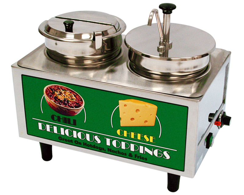 This dual well warmer is designed specifically for chili & cheese. The twin 7 quart wells are ideal for the toppings and it comes complete with the hinged inset lids and two long-handled, 3 ounce, one-piece ladles. It is constructed out of 18/8 stainless steel and comes with Benchmark USA’s three-year warranty for worry-free operation. The extra long legs provide easy access for cleaning and the eye-catching graphics will promote sales. Whether you serve chili-cheese dogs, nachos or chili-cheese fries you’ll appreciate that the pans, lids, ladles and adaptor plate are all removable for easy sink or dishwasher cleaning. It has a covered master switch and an adjustable thermostat for all cooking conditions.