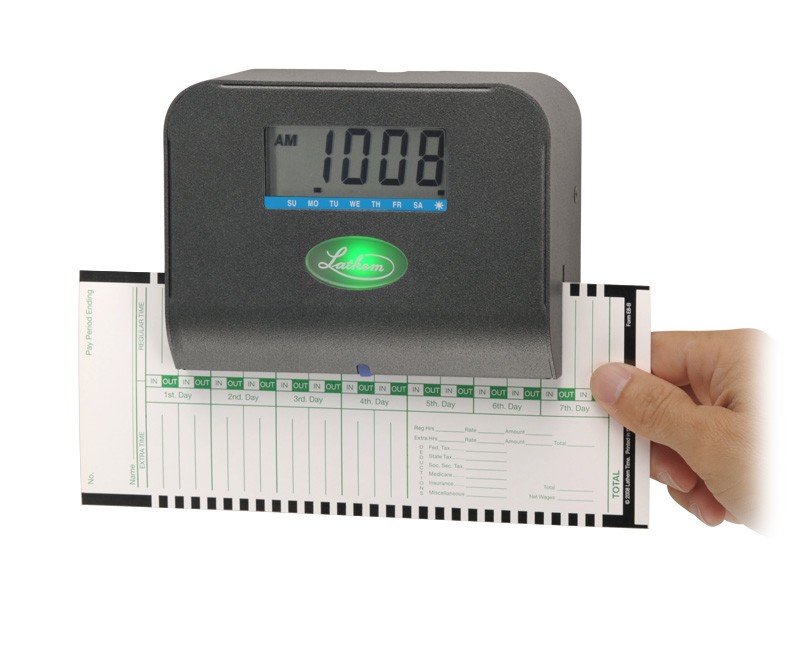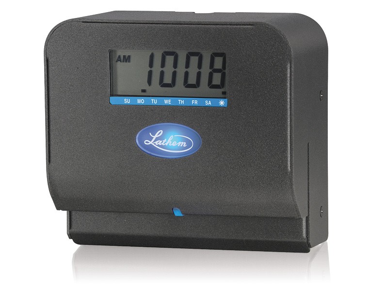 Lathem 800P Thermal Print Time Recorder. The New 800P features library-quiet, thermal printing which means no ribbons are needed! It's compact, clean and provides an amazingly crisp time registration. Lathem's patent-pending Tru-Align feature provides visual and audio alignment indication and automatically triggers an imprint when a time card is properly inserted. This ensures that the imprint only occurs within the boundaries of the card's print cell for legible and easy to read attendance records. The "Steel Tough" enclosure provides durable and maintenance-free operation, with no ink pad to fill or ribbon to replace.