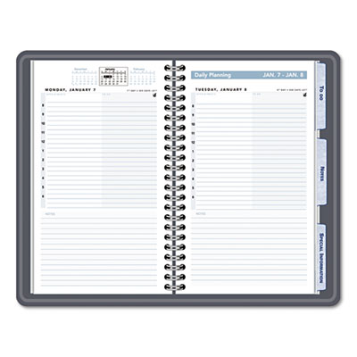 Daily format with half of each day for meetings/appointments, the other half for "To Do", Notes and Lists. Features tabbed sections for Special Information, To Do, and Notes. Tabbed Special Information Section includes 800 numbers, Future Planning, Web Addresses, and Four-Color World Map. Storage pocket for important papers and business cards. Size: 4 3/4 x 8; Page Color/Theme: White; Appointment Ruling: 8 AM to 6 PM.