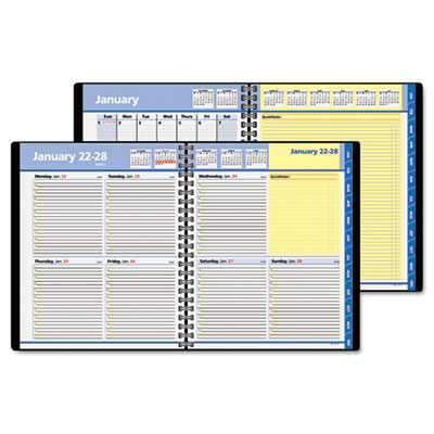 Yellow highlighted QuickNotes section on each spread for priority data. Tabbed monthly overviews for long-range planning. Telephone/address section keeps contact information at hand. Storage pocket for keeping loose papers. Size: 8 x 9 7/8; Page Color/Theme: White; Appointment Ruling: 8 AM to 5 PM.