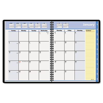 Unruled daily blocks for writing quick reminders. Yellow highlighted QuickNotes® section on each spread for priority data. Tabs for quick access to each month. Extra ruled pages for notes and lists. Size: 8 1/4 x 10 7/8; Page Color/Theme: White; Appointment Ruling: None.