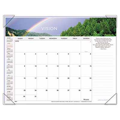 Full color panoramic motivational themed photographs and inspirational quotes change every month. Background design and color scheme coordinate with each image. Features unruled daily blocks, lined note space and full year calendar reference blocks. Three bonus pages with current year reference calendar, next year reference calendar, and dates to remember. Four corner poly holder with chipboard backing. Size: 22 x 17; Page Color/Theme: Motivational.