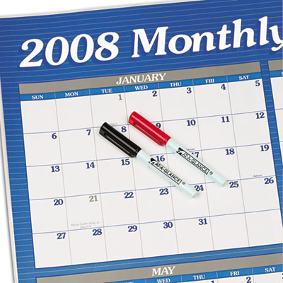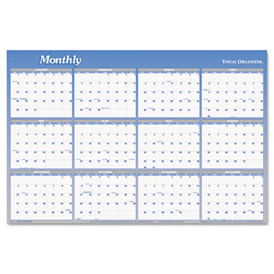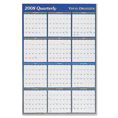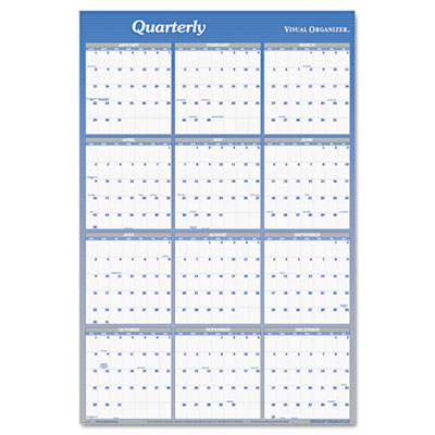 Horizontal monthly format reverses to vertical quarterly format. Laminated surface erases easily with a damp cloth. Size: 32 x 48; Page Color/Theme: White/Blue.
