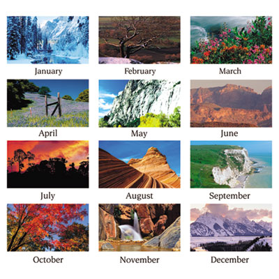 Scenic beauty in full color each month. Coordinating background design and color scheme. Bonus page includes current year reference calendar. Size: 12 x 17; Page Color/Theme: Scenic.
