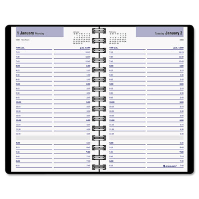 Soothing blue ruling accented with gray day bar. Use at desk or on the go. Size: 4 7/8 x 8; Page Color/Theme: White; Appointment Ruling: 7 AM to 4:45 PM Sat.; 7 AM to 7:45 PM Mon.-Fri..