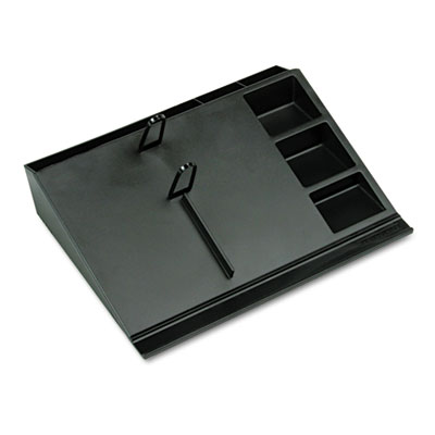 Compartments for self-stick notes, pens, supplies. Angled for easier reading and writing. Rubber feet protect desk. Size: 3 1/2 x 6 1/2; Color: Black; Material: Molded Plastic.