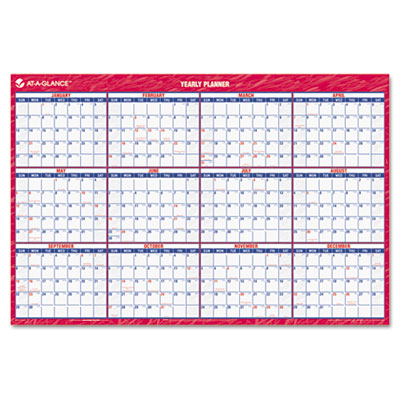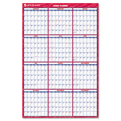 Write-on/wipe-off surface; for use with wet-erase markers. Bold, large, easy-to-read print on bright white background. One side features vertical yearly format and the other features a horizontal yearly format. Wet-erase marker included. Size: 32 x 48; Page Color/Theme: Blue/Red.