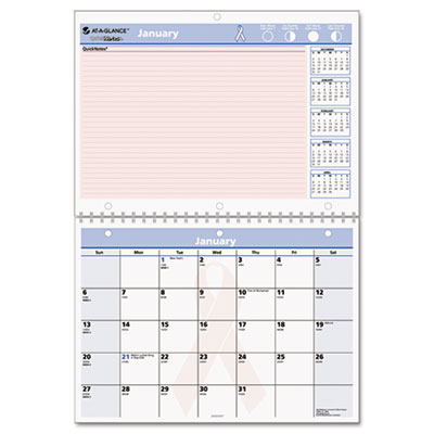 MWV, the maker of AT-A-GLANCE, supports the battle against breast cancer. Since 2008 over $500,000 has been donated to City of Hope for breast cancer research, treatment and education. Highlighted ruled QuickNotes® section for priority planning. Unruled daily blocks. Five-month calendar reference and monthly lunar cycle. Four-color printing; weekends shaded. Julian dates indicate days remaining until end of year. Wirebound. Three-hole punched. Page size: 11 x 8, opens to 16". Size: 11 x 8; Page Color/Theme: Blue/Pink/Breast Cancer Awareness.