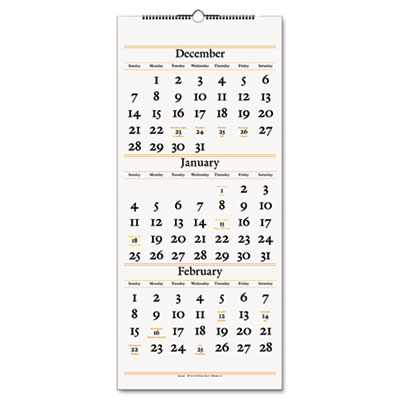 Attractive typeface on buff paper for a classic look. Current month with past and next month on each page. Large easy-to-read numbers for all three months. Size: 12 1/4 x 27; Page Color/Theme: White.
