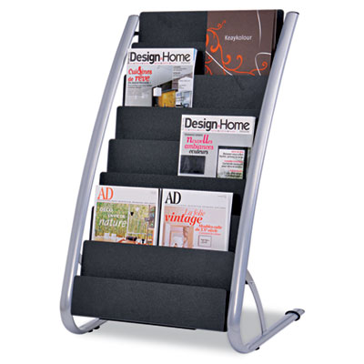 Who says your literature rack has to be boring? Unique design is a practical addition to any office décor. Clear acrylic pockets provide immediate identification of documents. Large base with non-slip pads offers extreme stability. Color: Black/Metallic Grey Steel; Overall Width: 22 7/8"; Overall Depth: 19 3/4".