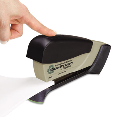 Fabricated with over 30% recycled material. Patented one finger spring-powered stapler in a compact design. Ergonomic styling with non-slip rubberized handle and base. Stands vertically and horizontally. Drop loading with half strip capacity (105 staples). Works with standard staples. Package includes one rack of staples. Stapler Type: Compact Desktop; Staple Capacity: Half Strip (105 Staples); Size of Staple Used: 1/4".
