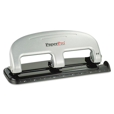 Punches cleaner, easier and absolutely no jamming. Low force design makes this punch 50% easier to use than standard hole punches. Punches through up to 20 sheets of paper with advanced cutting dies. Contains PaperPro's ® jam-free technology. Handle locks in down position for easier storage. Internal waste chamber with easy-to-empty rear positioned door. Convenient paper guide. Sheet Capacity: 20; Operating Method: Manual; Number of Holes: 3; Hole Diameter: 9/32 in.