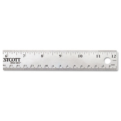 Nearly indestructible, warp-free, bend-resistant stainless steel ruler is ideal for precision measurement tasks. Attractive, brightly yet tastefully colored finish fits right into modern office environments. Etched, bright white standard and metric measurement markings ensure easy readability. First and last inches have 1/32-in. gradations. Drilled hook hole provides a convenient storage option. Ruler Type: Standard/Metric; Length: 12"; Standard Scale: 1/16";1/32".