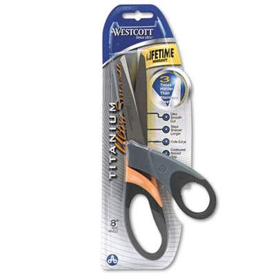 The high-performance titanium provides three times the strength of stainless steel. Resists the stickiness of tape and glue for an ultra smooth cut. The Soft RibGrip® allows for precision cutting. For right- or left-handed use. Cut Length: 3 1/2"; Scissor Length: 8"; Tip Type: Pointed.