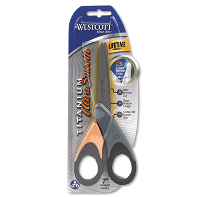 The high-performance titanium provides three times the strength of stainless steel. Resists the stickiness of tape and glue for an ultra smooth cut. The Soft RibGrip® allows for precision cutting. For right- or left-handed use. Cut Length: 3"; Scissor Length: 7"; Tip Type: Pointed.