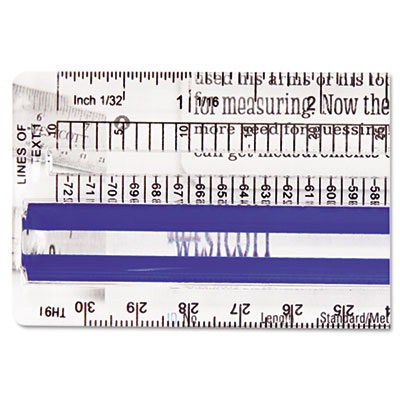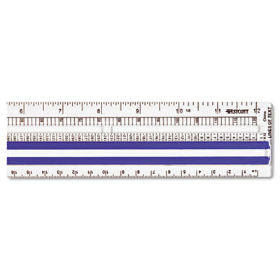 Center section isolates and magnifies one line at a time. Magnified portion ruled one side in 1/16", the other in 1/10". Scales correlate with horizontal and vertical printout columns. Plastic. Ruler Type: Highlighting Data Rulers; Length: 12"; Standard Scale: 1/8";1/16"; 1".