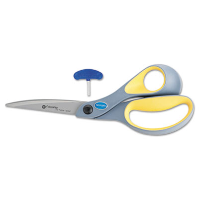 Titanium bonded scissors with comfortable ergonomic nylon soft handles can cut through multiple layers of even the toughest material. The oversized, adjustable hex screw allows you to adjust the cutting tension. Provides three times the strength of stainless steel scissors. Cut Length: 3 1/4"; Scissor Length: 8"; Tip Type: Blunt.