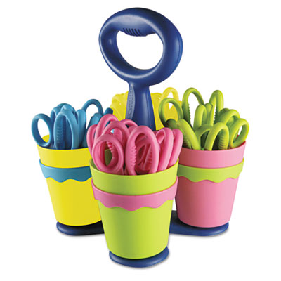 Convenient classroom-size caddy. Scissors have plastic handles and safety blades. Scissor handles and caddy are infused with Microban® antimicrobial product protection to inhibit the growth of bacterial odor. For left or right hand use. Cut Length: 2"; Scissor Length: 5"; Tip Type: Pointed.