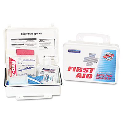 For cleaning up blood and other bodily fluid spills. Helps prevent disease and contamination. Reusable kit prevents disease and contamination. Plastic case includes: apron, eye cover, two nitrile gloves, fluid control solidifier, scooper/scraper, red biohazard plastic disposal bag with twist tie, wiper pad, one germicidal wipe and two antimicrobial wipes. Contains: Absorbent Pack;Antimicrobial Wipes;Apron;Disposal Bags;Eye Cover;Germicidal Wipes;Latex Gloves;Scooper/Scraper;Shoe Covers;Towels.