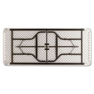 Lightweight and durable folding table for indoor and outdoor use. Legs fold into underside cavity for safe storage and easy transport. Made with blow-molded high-density polyethylene top is dent-, scratch- and water-resistant. Holds up to 500 lbs. evenly distributed. Square edge. Top Color: Platinum; Top Shape: Rectangular.