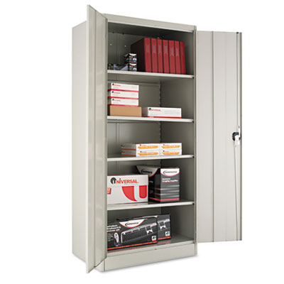 Industrial-grade steel with a durable powder coat finish. Easy-to-assemble, snap-together design. Doors open 225°.Keyless electronic coded lock records access and includes power loss backup features; requires 4 AA batteries (sold separately). Four heavy-duty shelves adjust on 1 3/4" centers and are reinforced with welded stiffeners. Color: Light Gray; Overall Width: 36"; Overall Depth: 24".