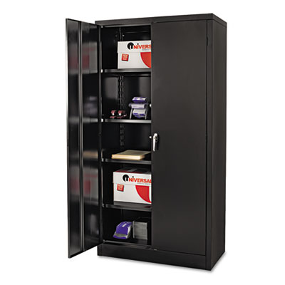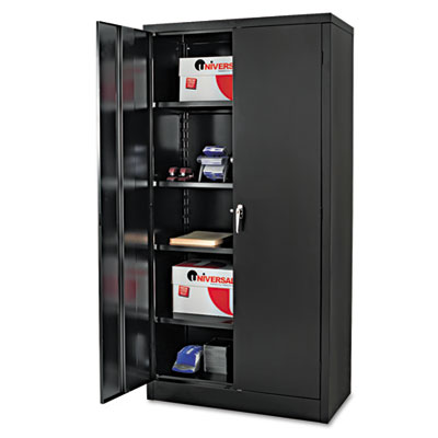 Quick-assemble steel cabinet with three-point locking bar system locks top, bottom and doors. Doors open 180° for easy access to contents. Cabinet made of industrial grade steel with enamel finish and satin chrome double handles. Unit has four adjustable shelves. Four adjustable shelves. Color: Black; Overall Width: 36"; Overall Depth: 18".