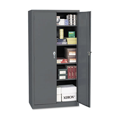 Assembled storage cabinet with three-point locking bar system locks top, bottom and doors. Doors open 180° for easy access to contents. Cabinet made of industrial grade steel with satin chrome double handles. Four adjustable shelves. Color: Charcoal; Overall Width: 36"; Overall Depth: 18".