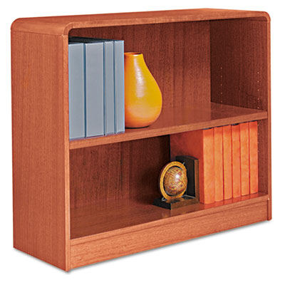 Wood veneer bookcase with radius corners, finished back and adjustable shelves. Rich wood veneer bookcases with fully-finshed backs. Sturdy 1" thick shelves support up to 90 lbs. Generous 11-1/2" deep shelves accommodate three-ring binders and large publications. Shelves adjust in 1 1/4" increments. Quick-lock fasteners allow easy assembly. Shelf count includes fixed middle and bottom shelves. Color: Medium Oak; Material: Wood Veneer; Shelf Count: 2.