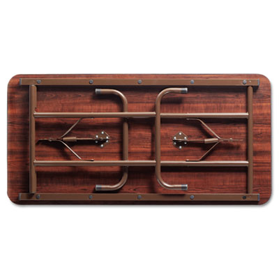 Scratch-resistant melamine top is 5/8" thick with a one-piece, 1 3/4" brown steel apron and black vinyl edging. Gravity leg-locking mechanism for quick set-up. Folds to 2 1/2" thick and locks for easy transport and storage. 1" diameter, brown steel legs with protective black plastic foot caps. Holds up to 1,200 lbs. evenly distributed. Top Color: Walnut; Top Shape: Rectangular.