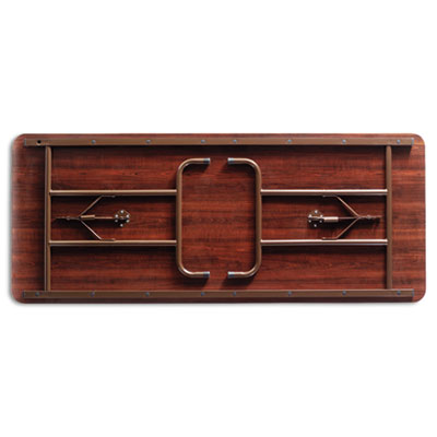Scratch-resistant melamine top is 5/8" thick with a one-piece, 1 3/4" brown steel apron and black vinyl edging. Gravity leg-locking mechanism for quick set-up. Folds to 2 1/2" thick and locks for easy transport and storage. 1" diameter, brown steel legs with protective black plastic foot caps. Holds up to 1,200 lbs. evenly distributed. Top Color: Walnut; Top Shape: Rectangular.