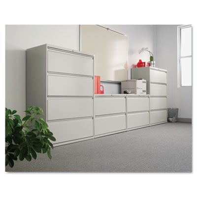 19 1/4" deep drawers with side-to-side hang rails to accommodate letter/legal hanging files. Full drawer extension on steel ball bearing telescoping slide suspension. Reinforced double-wall drawer fronts provide extra stability. Stylish full-width recessed pulls. Anti-tipping interlock system allows only one drawer to open at a time. Single key core removable lock with two keys. Color: Light Gray; Overall Width: 30"; Overall Depth: 19 1/4".