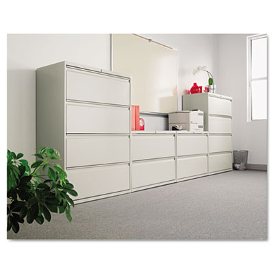 19 1/4" deep drawers with side-to-side hang rails to accommodate letter/legal hanging files. Full drawer extension on steel ball bearing telescoping slide suspension. Reinforced double-wall drawer fronts provide extra stability. Stylish full-width recessed pulls. Anti-tipping interlock system allows only one drawer to open at a time. Single key core removable lock with two keys. Color: Light Gray; Overall Width: 42"; Overall Depth: 19 1/4".