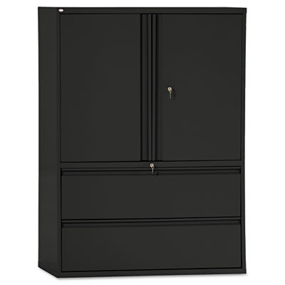 Two 19 1/4" deep file drawers operate on steel ball bearing, telescoping slide suspensions and hold letter and legal files. Reinforced double-wall drawer fronts provide extra stability. Cabinet provides ample storage and features hinged doors with full-length recessed pulls and two adjustable shelves. Single-key core removable locks with four keys. Four adjustable leveling glides. Metal construction with a durable powder coated finish. Color: Black; Overall Width: 42"; Overall Depth: 19 1/4".