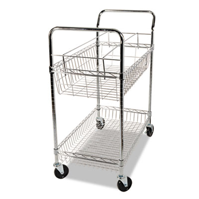 Mobile mail cart to sort and deliver all your mail big or small. Top basket can accommodate letter and legal size hanging folders. Sturdy bottom basket for larger packages and bulk goods. Heavy-duty steel tubing and wire withstands constant use. Nylon and rubber casters. Supports up to 500 lbs. Assembly Required. Color: Chrome; Capacity (Weight): 500 lbs.; Caster/Glide/Wheel: Two 4" Front Nylon and Two 6" Back Rubber Casters..