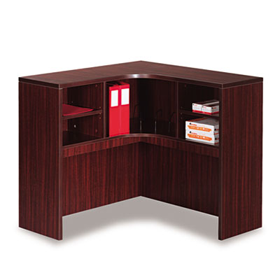 Space-efficient organization at its finest. Durable woodgrain laminate requires little maintenance and is ideal for high-activity areas. Wire bookcase dividers help organize open storage space. Valance channel and wire access facilitate optional task lighting. Adjustable shelves. Add door kit(s). Color: Mahogany; Overall Width: 41 1/4"; Overall Depth: 41 1/4".