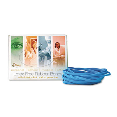 100% latex-free bands contain no natural rubber proteins and have the added benefit of an antimicrobial agent, which inhibits the growth of fungi, molds and bacteria that can cause product deterioration. Cyan blue color for easy identification. Approximate Count: 95; Size: 64; Length: 3 1/2".