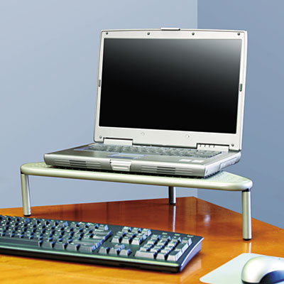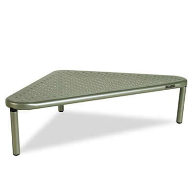 Triangular urban design turns a corner into usable space and brings a clean, modern look to any desktop. Raises monitor to ergonomic height to aid in reducing neck strain. Stows keyboard, games or files underneath when not in use. Heavy-duty construction supports up to 40 lbs. Enamel coated surface enhances workplace environments. Allsop® Metal Art Series. Stand Type: Corner Desktop; Width: 20"; Depth: 11 1/2".