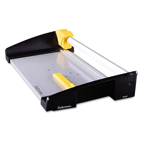 Fellowes Atom 180 Trimmer, 30 Sheets, Metal Base, 26 1/2" x 14 3/4". Heavy-duty trimmer cuts up to 30 sheets at once, and also slices through cardstock, plastic and foam board. Enclosed stainless steel rotary blade keeps user safe by preventing contact with the blade. Includes cutting guides for various paper sizes, photos and angled cuts. Auto paper clamp plus adjustable edge guide ensures cutting precision. Features durable metal base with nonskid feet.