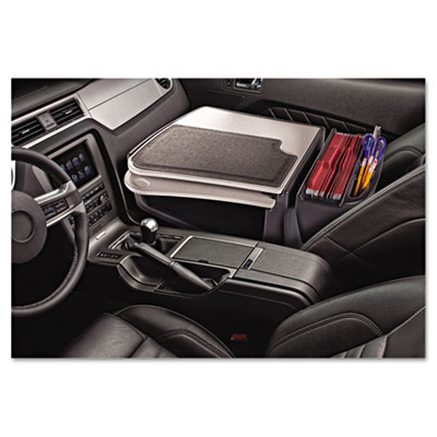 Top surface of this desk is covered with a rubber non-skid material; this ensures that a laptop, briefcase, PDA, or cell phone will keep from sliding while the vehicle is in motion. Features a pull-out writing surface with built-in clipboard, which provides a convenient area for doing paperwork and writing. The large storage area underneath is great for office tools and accessories and also for keeping a laptop out of sight. Additional storage compartments hold small supplies such as pens, maps, etc. This desk model is ideal for those needing to keep mobile equipment accessible during the day as well as needing a convenient area for writing. Desktop Supplies Organizer Type: Desktop Sorter.