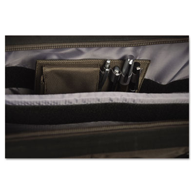 Ideal for true road warriors. Great for storing hanging files, a laptop, pens and pencils, or even clothes on a short trip. A removable hanging file case with lid and handles is self standing and great for holding files. Two adjustable dividers with Velcro® allow you to customize the interior any way you like, or remove the dividers to add more space for clothes. Great for storing laptops 17" or smaller, Netbooks, and Tablet PC's. Two webbed laptop security straps help keep your computer secure. For Device Type: Business Documents; Laptop; Material(s): 1,680-Denier Ballistic Nylon; Carrying Method: Shoulder Strap; Handle.