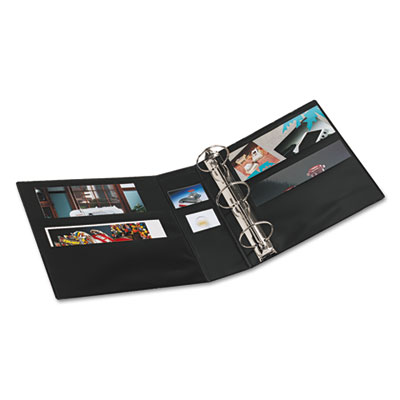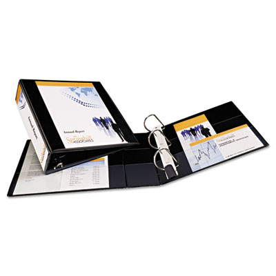 Create a customized front cover and spine. Nonstick, archival-safe material won't lift ink or toner off of printed pages. EZ-Turn™ ring for smooth page turning. Back-mounted rings allow pages to lie flat. Wider front and back binder panels fully cover standard dividers and sheet protectors. PVC-free. Capacity Range [Max]: 3"; Sheet Capacity: 600; Color(s): Black.