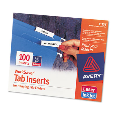 Create titles instantly for hanging files using your laser printer, inkjet printer or typewriter. White background makes the text jump out, resulting in clearly readable labels for your files. Easy to use with free AveryŽ templates and software. Side-by-side folding design allows printing on both sides of the insert; tabs not included. File Insert/Tab Type: Hanging Folder Tab Inserts; Tab Cut: 1/5; Color(s): White.