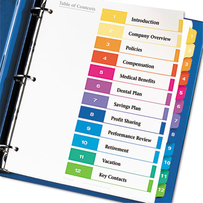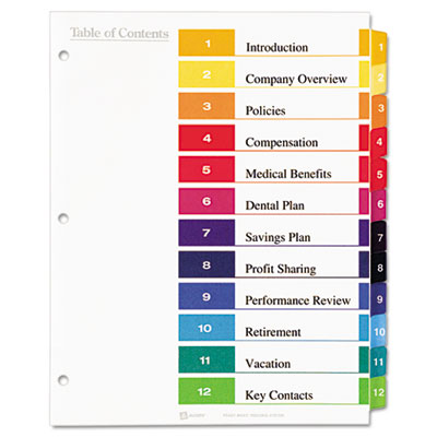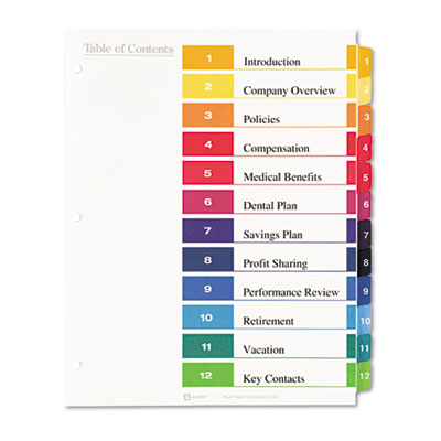 Print or photocopy titles framed with bright colors matched to preprinted tabs. Now three ways stronger to last longer. Stronger heavier weight paper, stronger tab reinforcements and double-sided hole reinforcements. Tab Style: 12-Tab; Tab Color(s): Multicolor; Index Divider Size: 11 x 8 1/2.